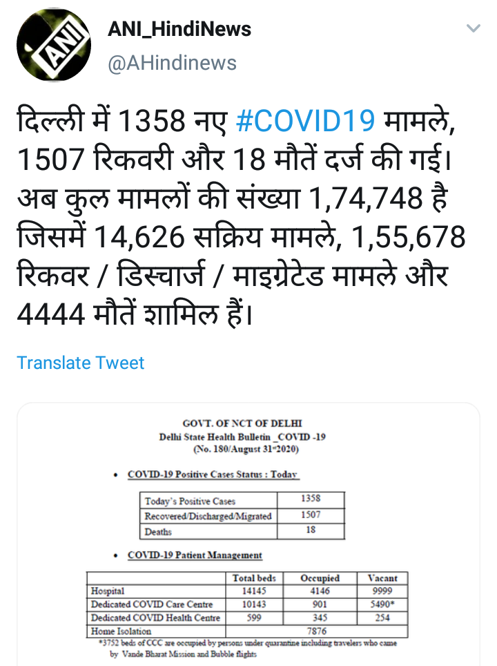 ताज्या आकडेवारी नुसार, दिल्लीत आतापर्यंत जवळपास 15 लाख 83 हजार 485 टेस्ट करण्यात आल्या आहेत. त्यातील 5675 आरटीपीसीआर टेस्ट आणि 8,714 रैपिड एंटिजेन टेस्ट करण्यात आल्या आहेत.