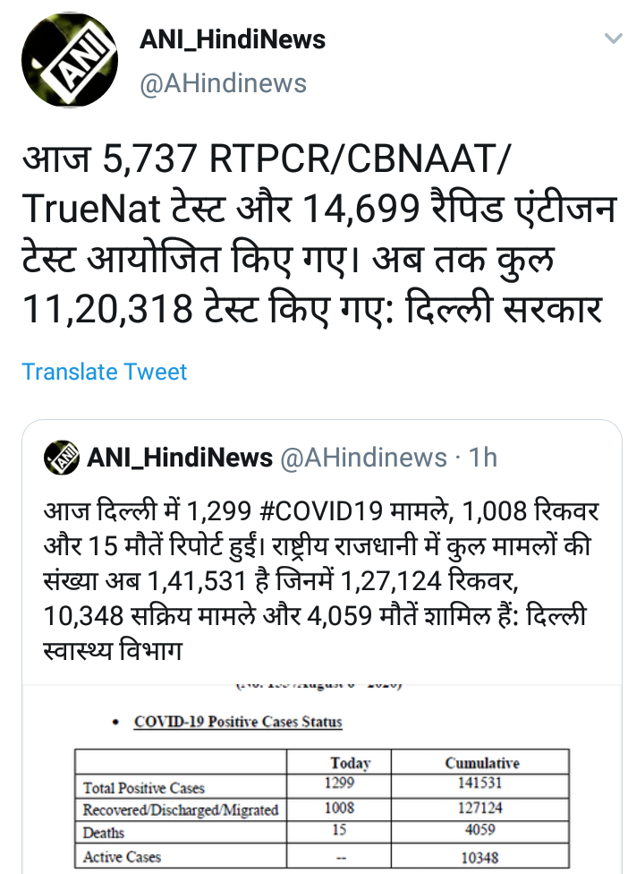 ताज्या आकडेवारी नुसार, दिल्लीत आतापर्यंत जवळपास 11 लाख 20 हजार 318 टेस्ट करण्यात आल्या आहेत. त्यातील 5737 आरटीपीसीआर टेस्ट आणि 14,699 रैपिड एंटिजेन टेस्ट करण्यात आल्या आहेत.