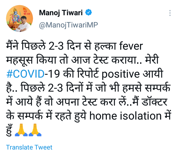 देशात कोरोना रुग्णांची संख्या झपाट्याने वाढत आहे. सर्वच राज्यात रुग्ण वाढ उच्चांक गाठत आहे. त्यातच आता भाजपचे खासदार मनोज तिवारी यांना देखील कोरोनाची लागण झाली आहे. त्यांनी स्वतः ट्विट करत याबाबत माहिती दिली आहे.