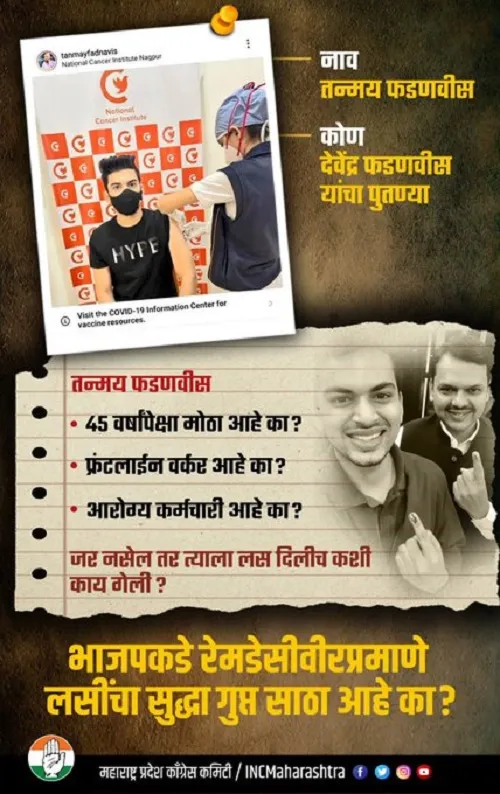 तन्मय फडणवीस 45 वर्षांपेक्षा मोठा आहे का? फ्रंटलाईन वर्कर आहे का? आरोग्य कर्मचारी आहे का? भाजपकडे रेमडेसिव्हीरप्रमाणे लसींचाही गुप्त साठा आहे का?, असे प्रश्न काँग्रेसने ट्वीटच्या माध्यमातून उपस्थित केले आहेत.
