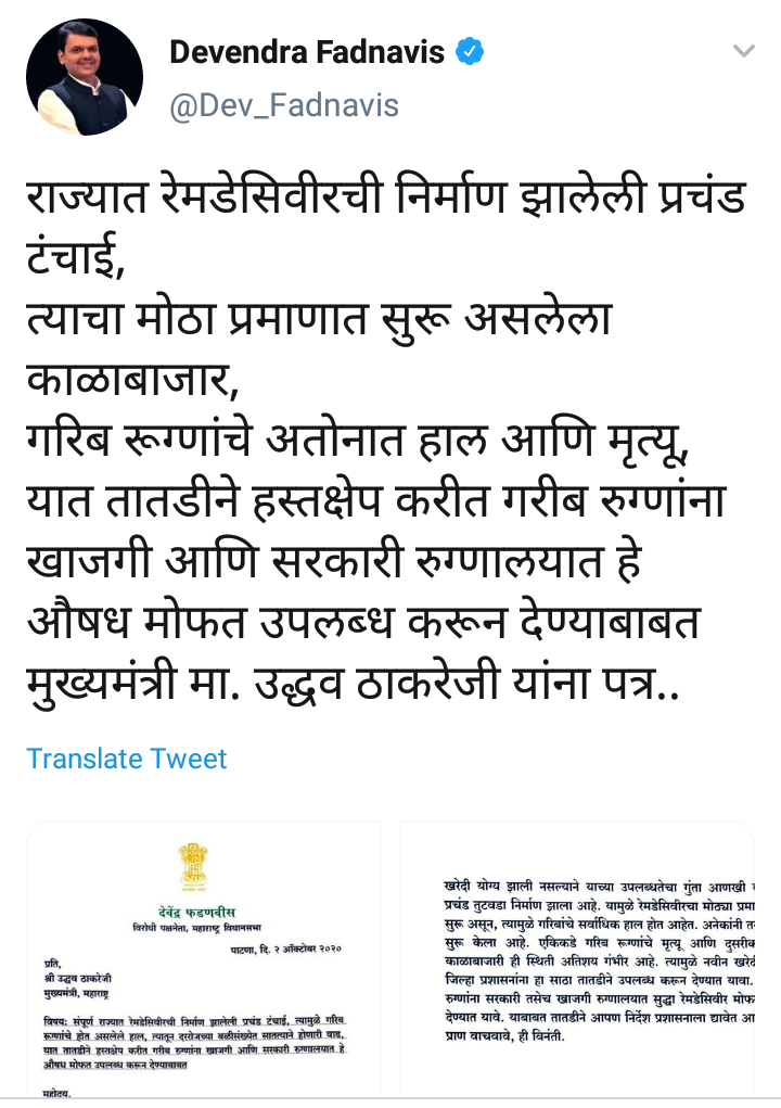 पुढे ते म्हणाले, एकिकडे गरीब रूग्णांचे मृत्यू आणि दुसरीकडे रेमडेसिवीरची काळाबाजारी ही स्थिती अतिशय गंभीर आहे. त्यामुळे नवीन खरेदी प्रक्रिया राबवून जिल्हा प्रशासनांना हा साठा तातडीने उपलब्ध करून देण्यात यावा. त्यासोबतच सर्व गरीब रुग्णांना सरकारी किंवा खाजगी रुग्णालयात सुद्धा रेमडेसिवीर मोफत उपलब्ध करून देण्यात यावी अशी मागणी देखील देवेंद्र फडणवीस यांनी या पत्रामध्ये केली आहे.