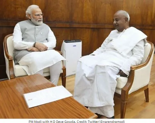10 डिसेंबर रोजी होणाऱ्या विधानपरिषद निवडणुकीसाठी प्रादेशिक पक्ष आणि भाजपमध्ये निवडणूकपूर्व युती असू शकते या चर्चेंना दुजोरा देत JD(S) सुप्रीमो एचडी देवेगौडा यांनी मंगळवारी पंतप्रधान नरेंद्र मोदी यांच्याशी चर्चा केली. मंगळवारी दुपारी, मोदींनी गौडा यांचा हात धरून त्यांना बसण्याची विनंती केल्याचे फोटो व्हायरल झाले.