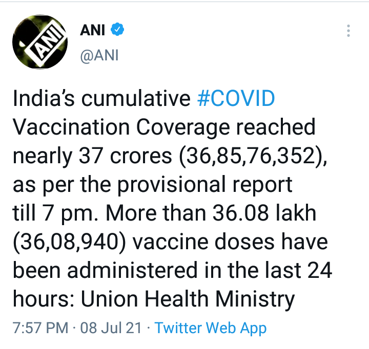 देशव्यापी कोविड प्रतिबंधक लसीकरण मोहिमेअंतर्गत, लसीच्या एकूण 36 कोटींहून अधिक मात्रा देऊन भारताने महत्वाचा टप्पा ओलांडला आहे. सायंकाळी 7 वाजता मिळालेल्या माहितीनुसार, आतापर्यंत 36 कोटी 85 लाख 76 हजार 352 मात्रा देण्यात आल्या आहेत.