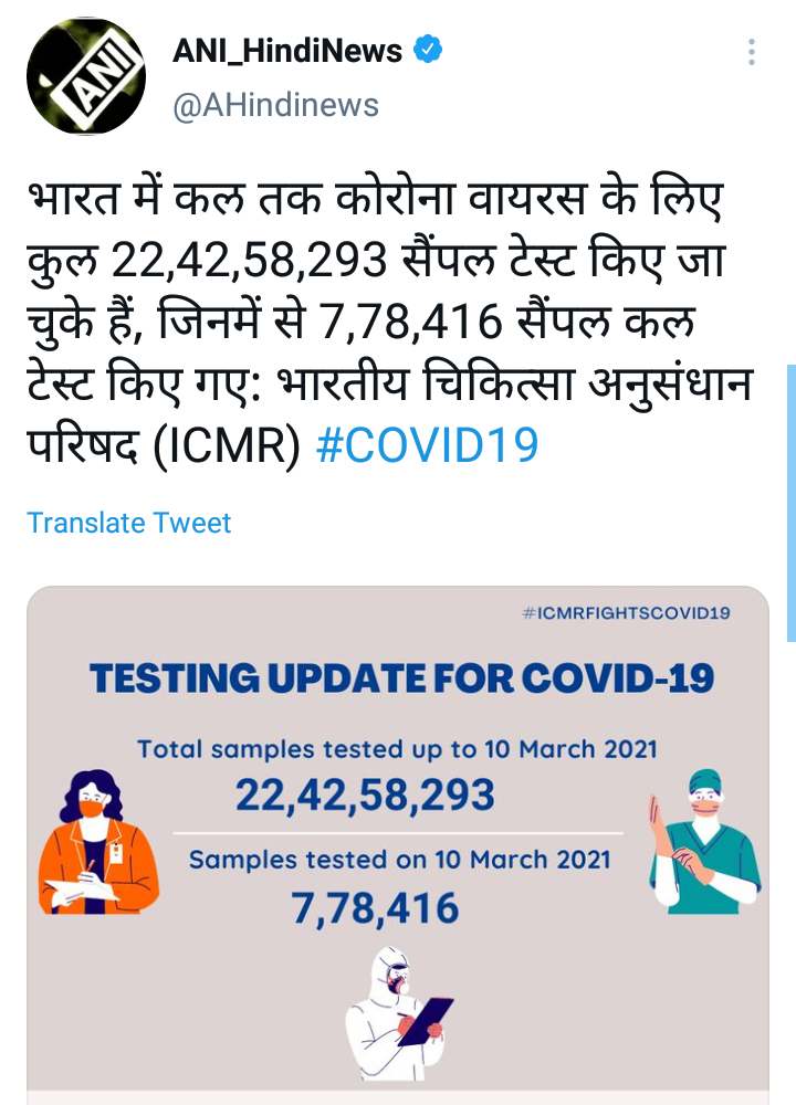 आतापर्यंत देशात 22 कोटी 42 लाख 58 हजार 293 नमुन्यांची तपासणी करण्यात आली आहे. त्यापैकी 7 लाख 78 हजार 416 कोरोना चाचण्या बुधवारी (दि.10 मार्च 2021) एका दिवसात करण्यात आल्या.