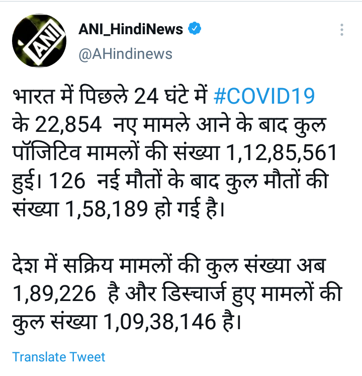 भारतात मागील 24 तासात 22 हजार 854 ,नवे कोरोनाबाधित रुग्ण आढळून आले. तर 126 रुग्णांचा मृत्यू झाला आहे. त्यामुळे देशातील एकूण कोरोनाबाधितांची संख्या आता 1 कोटी 12 लाख 85 हजार 561 वर पोहचली असून, मृतांची संख्या 1 लाख 58 हजार 189 एवढी आहे.