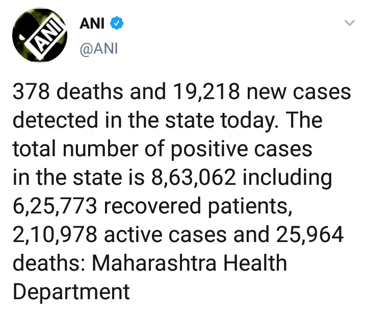 महाराष्ट्रात दिवसेंदिवस कोरोना रुग्णांची संख्या वेगाने वाढतच आहे. मागील 24 तासात आता पर्यंतचे सर्वाधिक म्हणजेच 19,218 नवे कोरोनाबाधित रुग्ण आढळून आले. तर 378 रुग्णांचा मृत्यू झाला. त्यामुळे राज्यातील एकूण कोरोना बाधितांची संख्या 8 लाख 63 हजार 062 वर पोहचली आहे. तर मृतांचा एकूण आकडा 25 हजार 964 एवढा आहे. त्यामुळे राज्यात चिंताजनक परिस्थिती निर्माण झाली आहे.