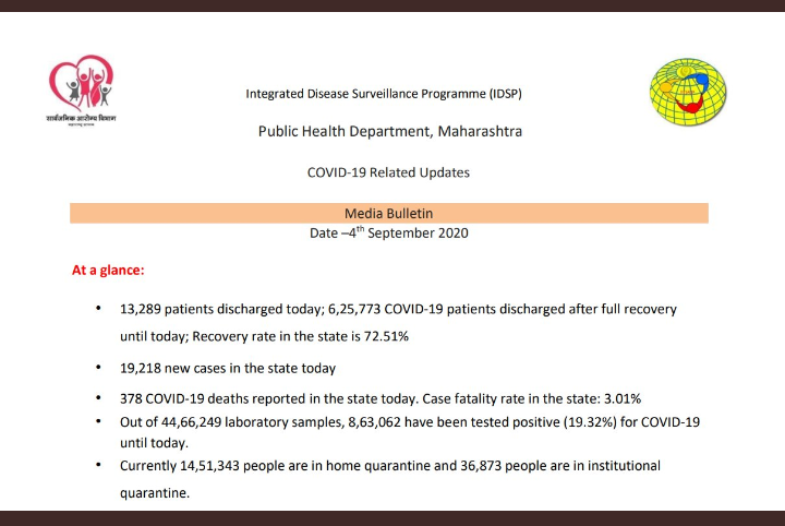 प्रयोगशाळेत आतापर्यंत तपासणीसाठी पाठविण्यात आलेल्या 44 लाख 66 हजार 249 नमुन्यांपैकी 8 लाख 63 हजार 062 रुग्णांचे रिपोर्ट पॉझिटिव्ह आले आहेत. सध्या राज्यात 14 लाख 51 हजार 343 लोक होम क्वारंटाईनमध्ये असून, 36 हजार 873 लोक संस्थात्मक क्वारंटाईनमध्ये आहेत.