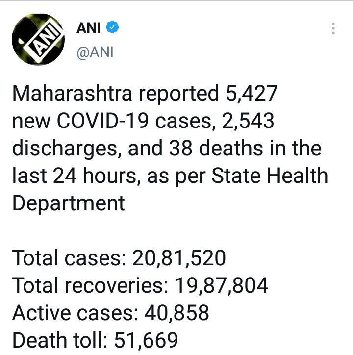 महाराष्ट्रात मागील 24 तासात 5,427 नवीन कोरोनाबाधित रुग्णांची नोंद झाली असून 38 जणांचा मृत्यू झाला आहे. त्यामुळे राज्यातील एकूण कोरोना बाधितांची संख्या 20 लाख 81 हजार 520 वर पोहचली आहे. तर मृतांचा एकूण आकडा 51 हजार 669 एवढा आहे.
