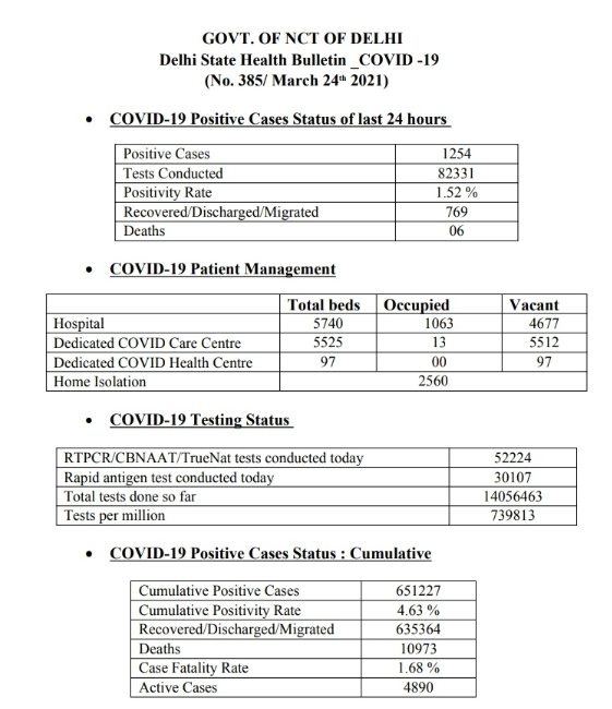 राजधानी दिल्लीत दररोज सरासरी 100 पेक्षा जास्त रुग्ण आढळून येत आहेत. मागील 24 तासात दिल्लीत 1,254 नव्या कोरोना रुग्णांची नोंद झाली. ही या वर्षातील आता पर्यंतची उच्चांकी संख्या आहे. यापूर्वी 18 डिसेंबरला 1418 नागरिकांना संसर्ग झाला होता. त्यानंतर 96 दिवसांनी सर्वाधिक रुग्ण आढळून आले आहेत.