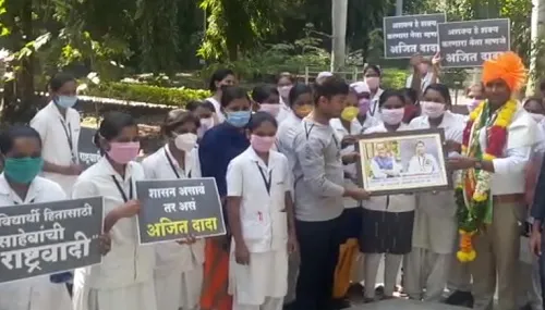 कोरोना व कडक संचारबंदी काळात नर्सिंग कॉलेजमधील विद्यार्थी, विद्यार्थिनीनी आपला स्व:ताचा जीव धोक्यात घालून सोलापूर शहराचा घरोघरी जाऊन यशस्वीपणे कोरोना सर्व्हे केला होता. मात्र, मागील चार महिन्यांपासून वेतन रखडले होते. राष्ट्रवादी विद्यार्थी काँग्रेसचे सुहास कदम, उपमुख्यमंत्री अजित पवार यांच्या प्रयत्नामुळे विद्यार्थ्यांच्या खात्यावर प्रत्येकी दहा हजार रुपये जमा झाल्यामुळे नर्सिंग महाविद्यालयाच्या विद्यार्थी विद्यार्थिनींनी अनोख्या पद्धतीने उपमुख्यमंत्री अजित पवार यांचे आभार मानले.