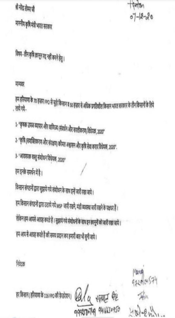 कृषी कायद्यांविरोधात दिल्लीच्या सीमेवर आंदोलन करणाऱ्या शेतकरी संघटनांनी आज ‘भारत बंद’ची हाक दिली आहे. मात्र, सोमवारी हरियाणातील काही शेतकरी संघटनांनी कृषीमंत्री नरेंद्र सिंह तोमर यांची भेट घेऊन नवे कृषी कायदे मागे न घेण्याची मागणी केली. शेतकऱ्यांनी यासंदर्भात पत्रही तोमर यांना दिले आहे.