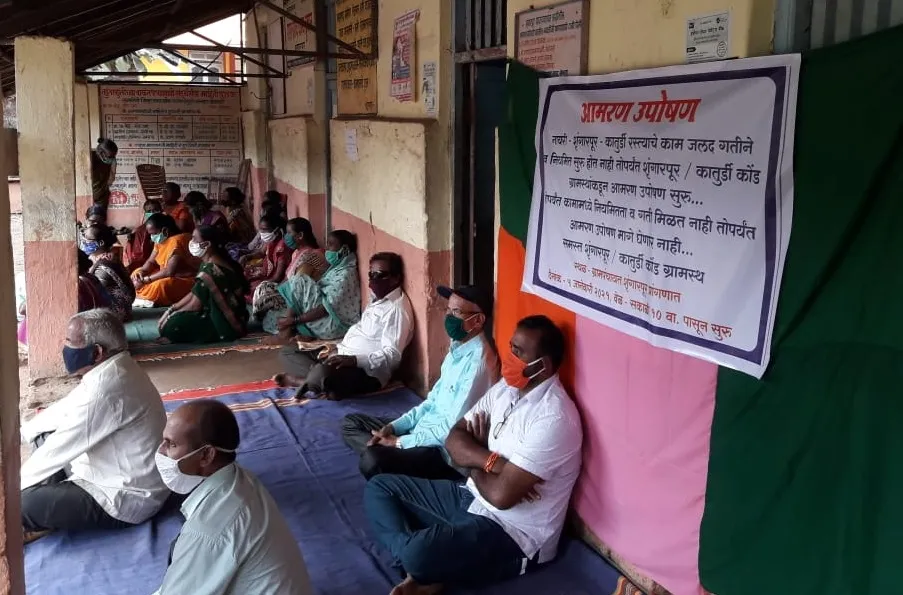 संगमेश्वर जवळच्या नायरी शृंगारपूर कातुर्डी रस्त्याचे मुख्यमंत्री ग्रामसडक योजनेतून काम सुरू होते परंतु हे काम गेले अनेक दिवस ठप्प आहे हे काम सुरू व्हावे यासाठी ग्रामस्थांनी आमरण उपोषण सुरू केले असून ग्रामपंचायती समोरच हे आंदोलन सुरू केले आहे.