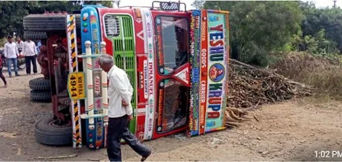 करवीर तालुक्यातील निगवे दुमाला-केर्ले रस्त्यावर पडलेल्या मोठ-मोठ्या खड्ड्यांमुळे ऊस वाहतूक करणारा ट्रक पल्टी झाला. सुदैवाने कोणतीही जीवितहानी झाली नाही.