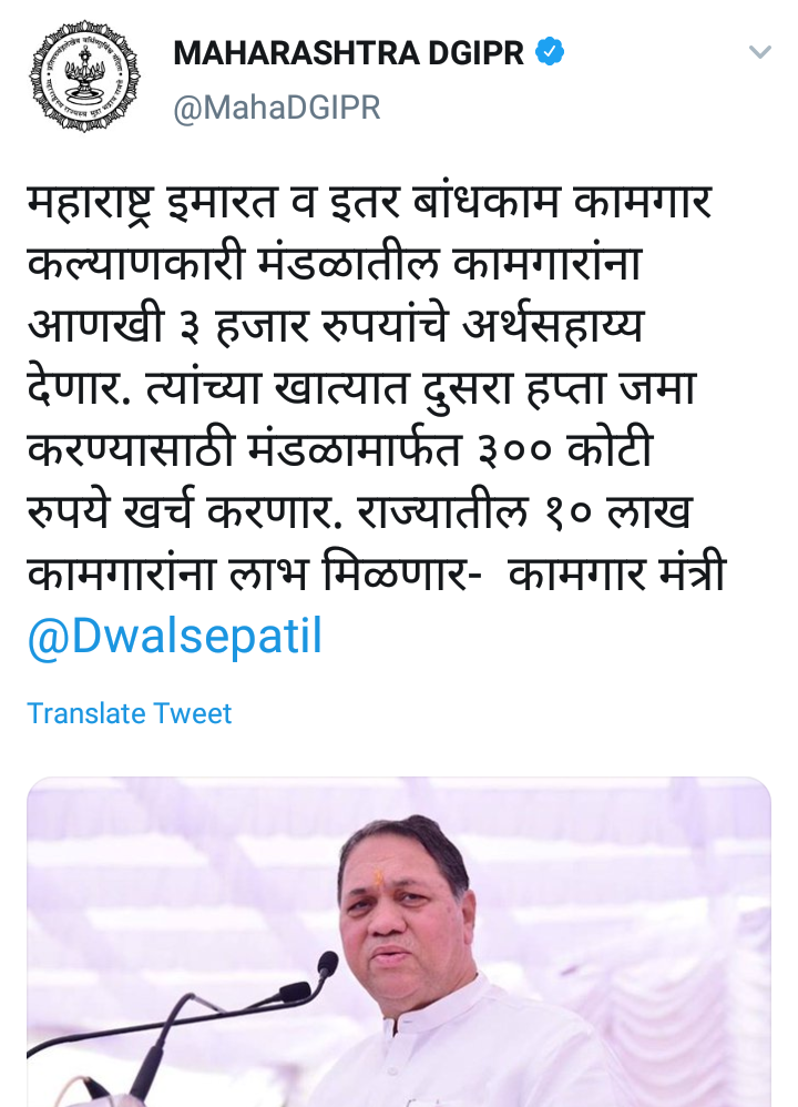 महाराष्ट्र इमारत व इतर बांधकाम कामगार कल्याणकारी मंडळातील नोंदीत सक्रिय (जिवित) बांधकाम कामगारांना आणखी ३ हजार रुपयांचे अर्थसहाय्य देण्यात येणार आहे. बांधकाम कामगारांच्या खात्यात दुसरा हप्ता मंजूर करण्याबाबत कामगार मंत्री दिलीप वळसे-पाटील यांनी मुख्यमंत्री उद्धव ठाकरे आणि उपमुख्यमंत्री अजित पवार यांच्याशी चर्चा करून निर्णय घेतला आहे. या निर्णयाचा फायदा राज्यातील 10 लाख बांधकाम कामगारांना मिळणार असून या अर्थसहाय्य वाटपावर मंडळामार्फत 300 कोटी रुपये खर्च करण्यात येणार आहेत.