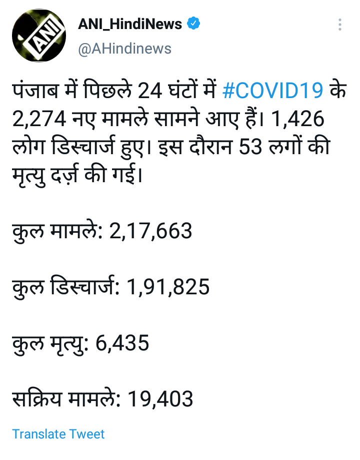 ताज्या आकडेवारी नुसार, पंजाबमध्ये सद्य स्थितीत 19 हजार 403 रुग्णांवर विविध रुग्णालयात उपचार सुरू आहेत. यामध्ये जालंधरमध्ये सर्वाधिक म्हणजेच 2629 ॲक्टिव्ह रुग्ण आहेत. सास नगर 2561, लुधियाना 2167, पटियाला 2064 तर अमृतसरमधील 1805 रुग्णांवर उपचार सुरु आहेत.