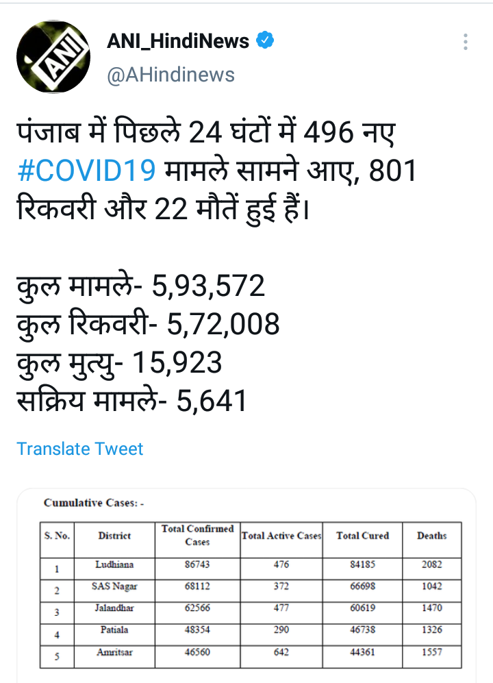 ताज्या आकडेवारी नुसार, पंजाबमध्ये सद्य स्थितीत 5 हजार 641 रुग्णांवर विविध रुग्णालयात उपचार सुरू आहेत. यामध्ये जालंधरमध्ये सर्वाधिक म्हणजेच 477 ॲक्टिव्ह रुग्ण आहेत. लुधियाना 476, पटियाला 290 तर अमृतसरमधील 642 रुग्णांवर उपचार सुरु आहेत.