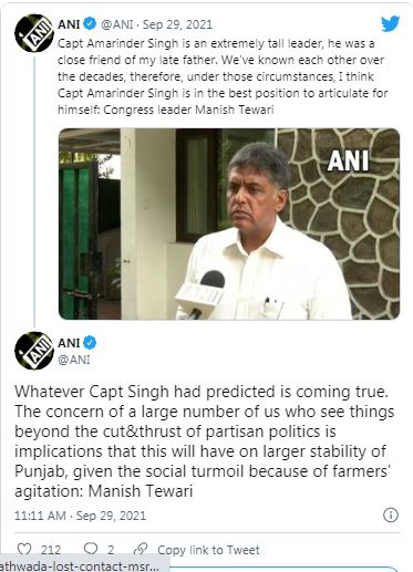 सध्या देशाच्या राजकीय वर्तुळात मोठी चर्चा सुरू आहे ती पंजाबमधल्या राजकीय भूकंपाची. काही दिवसांपूर्वी माजी मुख्यमंत्री कॅप्टन अमरिंदर सिंग यांनी राजीनामा दिल्यानंतर मंगळवारी नवज्योत सिंग सिद्धू यांनी देखील पंजाब काँग्रेस अध्यक्षपदाचा राजीनामा सोनिया गांधी यांच्याकडे पाठविला. त्यामुळे पंजाब काँग्रेसमधील आपापसातील मतभेद आणि पराकोटीचा वाद समोर आला आहे. एकूणच काँग्रेसमध्ये दोन गट पडल्याचं दिसत आहे. आता काँग्रेसचे ज्येष्ठ नेते आणि खासदार मनिष तिवारी यांनी कॅप्टन अमरिंदर सिंग यांचं कौतुक करत सध्याच्या राजकारणावरून नवज्योत सिंग सिद्धूवर अप्रत्यक्षरित्या निशाणा साधला आहे.