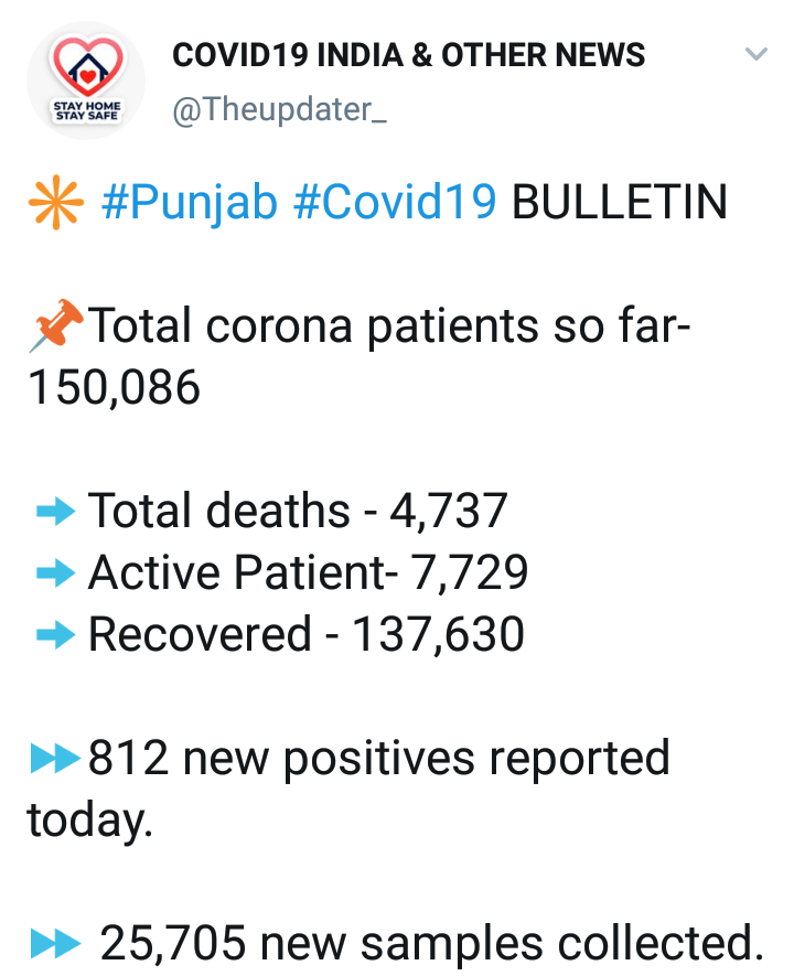 ताज्या आकडेवारी नुसार, पंजाबमध्ये आतापर्यंत जवळपास 31 लाख 28 हजार 711 टेस्ट करण्यात आल्या आहेत. सद्य स्थितीत 7 हजार 719 रुग्णांवर विविध रुग्णालयात उपचार सुरू आहेत. त्यातील 148 रुग्णांना अक्सिजन सपोर्टवर ठेवण्यात आले आहे. तर 19 जण व्हेंटिलेटरवर आहेत.