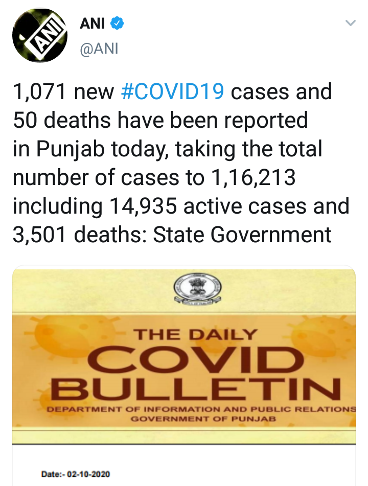 ताज्या आकडेवारी नुसार, पंजाबमध्ये आतापर्यंत जवळपास 19 लाख 02 हजार 976 टेस्ट करण्यात आल्या आहेत. सद्य स्थितीत 14 हजार 935 रुग्णांवर विविध रुग्णालयात उपचार सुरू आहेत. त्यातील 318 रुग्णांना अक्सिजन सपोर्टवर ठेवण्यात आले आहे. तर 59 जण व्हेंटिलेटरवर आहेत.