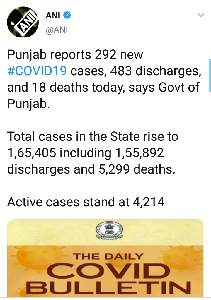 ताज्या आकडेवारी नुसार, पंजाबमध्ये आतापर्यंत जवळपास 38 लाख 21 हजार 222 टेस्ट करण्यात आल्या आहेत. सद्य स्थितीत 4 हजार 214 रुग्णांवर विविध रुग्णालयात उपचार सुरू आहेत. त्यातील 73 रुग्णांना अक्सिजन सपोर्टवर ठेवण्यात आले आहे. तर 15 जण व्हेंटिलेटरवर आहेत.