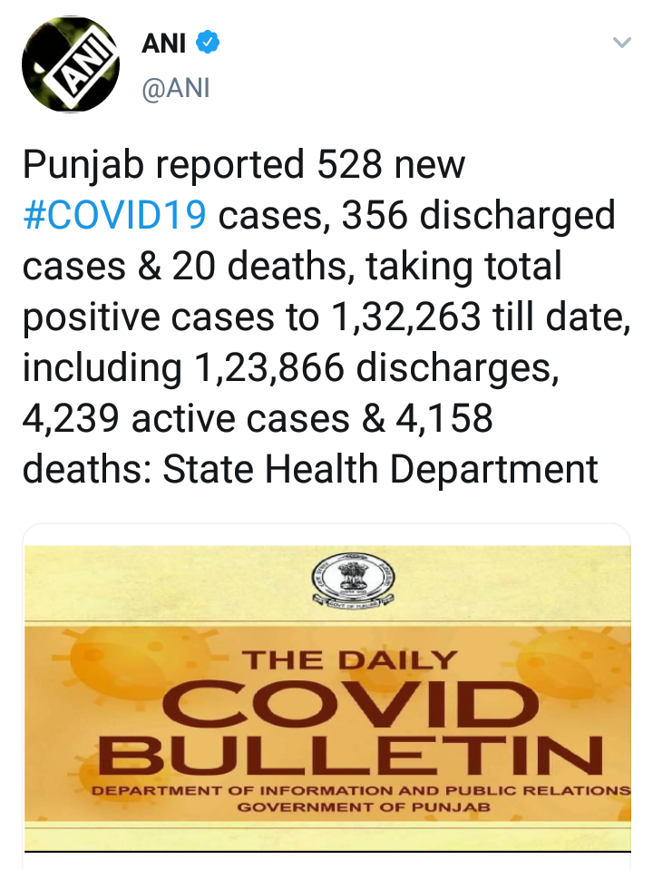 ताज्या आकडेवारी नुसार, पंजाबमध्ये आतापर्यंत जवळपास 25 लाख 38 हजार 610 टेस्ट करण्यात आल्या आहेत. सद्य स्थितीत 4 हजार 239 रुग्णांवर विविध रुग्णालयात उपचार सुरू आहेत. त्यातील 102 रुग्णांना अक्सिजन सपोर्टवर ठेवण्यात आले आहे. तर 20 जण व्हेंटिलेटरवर आहेत.