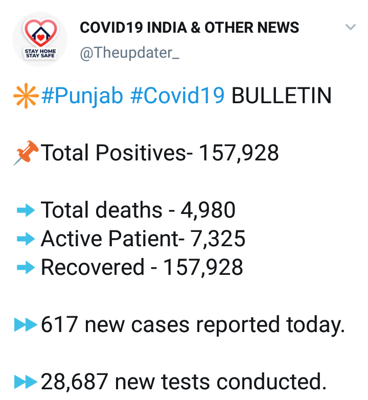 ताज्या आकडेवारी नुसार, पंजाबमध्ये आतापर्यंत जवळपास 34 लाख 23 हजार 632 टेस्ट करण्यात आल्या आहेत. सद्य स्थितीत 7 हजार 325 रुग्णांवर विविध रुग्णालयात उपचार सुरू आहेत. त्यातील 155 रुग्णांना अक्सिजन सपोर्टवर ठेवण्यात आले आहे. तर 22 जण व्हेंटिलेटरवर आहेत.
