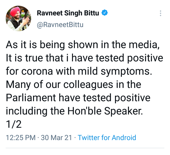 पंजाबमध्ये कोरोना रुग्णांची संख्या झपाट्याने वाढत आहे. त्यातच आता लुधियानाचे खासदार रवनीत सिंह बिट्टू यांना कोरोनाची लागण झाली आहे. त्यांनी स्वतः ट्विट करत याबाबत माहिती दिली.