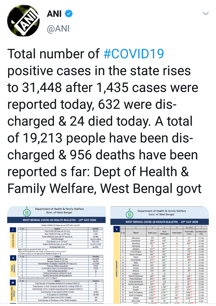 पश्चिम बंगालमध्ये कोरोनाग्रस्तांची संख्या दिवसेंदिवस वेगाने वाढत आहे. मागील 24 तासात 1435 नव्या कोरोना रुग्णांची नोंद झाली. तर 24 जणांनी कोरोनामुळे आपला जीव गमावला आहे. त्यामुळे राज्यातील कोरोनाबाधितांच्या एकूण संख्या 31 हजार 448 वर पोहोचली आहे.