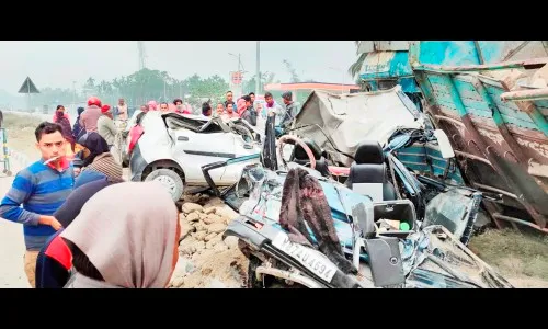 पश्चिम बंगालमध्ये दाट धुक्मयामुळे घडलेल्या भीषण रस्ता अपघातात 14 जणांचा मृत्यू झाला आहे. मंगळवारी रात्री घडलेल्या या दुर्घटनेत विवाह समारंभ आटोपून परतणाऱया वऱहाडींवर काळाचा घाला घातला आहे. वऱहाडींना घेऊन जाणारे वाहन दगडवाहू ट्रकवर आदळल्याने ही दुर्घटना घडल्याची माहिती सूत्रांकडून देण्यात आली. या अपघातातील मृतांमध्ये चार अल्पवयीन मुलांचाही समावेश आहे. तसेच अनेक जण गंभीर जखमी झाले आहेत. जखमींना रुग्णालयात दाखल करण्यात आले आहे. येथील जलपाईगुडी जिह्यातील धुपगुडी येथे ही घटना घडली.