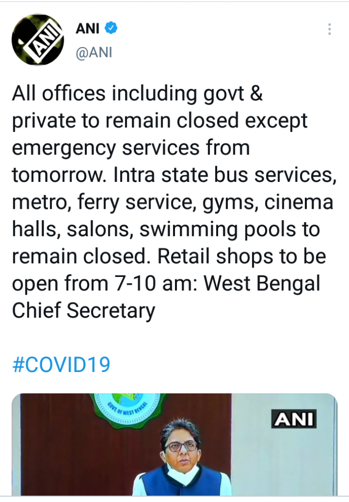ममता सरकारचे मुख्य सचिव अलपन बंदोपाध्याय यांनी याबाबतचे निर्देश जारी केले आहेत. या लॉकडाऊनची सुरुवात 16 मे रोजी सकाळी 6 वाजल्यापासून होणार असून 30 मे रोजी सायंकाळी 6 वाजेपर्यंत हा लॉकडाऊन लागू असणार आहे. या काळात केवळ आपत्कालीन सेवांना परवानगी देण्यात येईल.