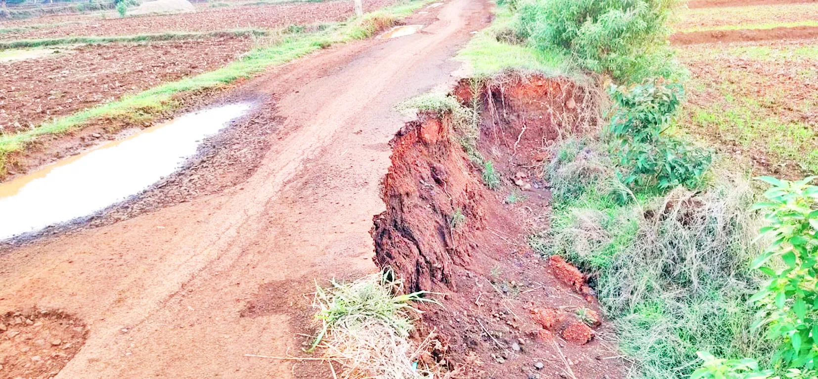 दोन वर्षात मुसळधार पाऊस झाला. यावेळी पावसाचे पाणी पूर्णपणे रस्त्यावर आले होते. यामुळे रस्त्यावरील काही भाग पावसाच्या पाण्यामुळे वाहून गेला व रस्त्याच्या चार ते पाच ठिकाणी मोठे भगदाड पडले. सध्या या रस्त्यावरून मोठी वाहने जाणे अवघड बनले आहे तसेच रात्रीच्या वेळी हा रस्ता धोकादायक