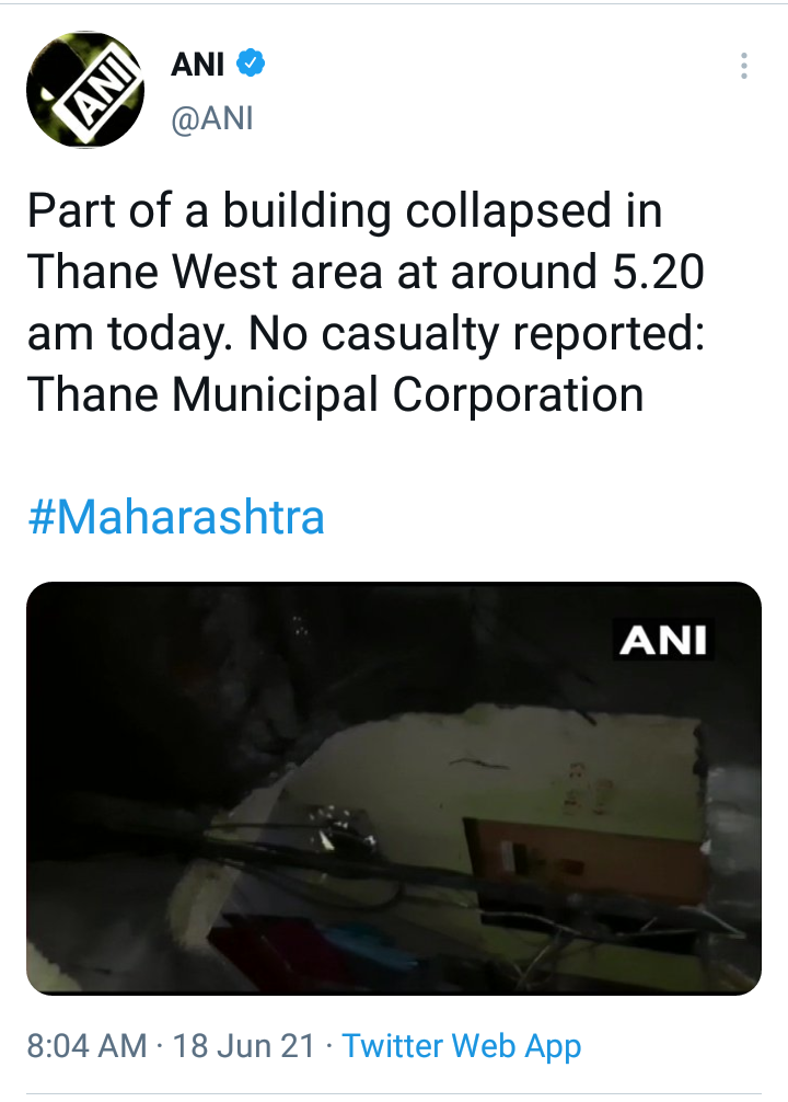 मिळालेल्या माहितीनुसार, ठाणे पश्चिम येथे इमारतीचा एक भाग कोसळल्याची दुर्घटना आज सकाळी 5.30 च्या सुमारास झाली आहे. दरम्यान यामध्ये कोणतीही जीवितहानी नाही अशी पालिका प्रशासनाची माहिती आहे.