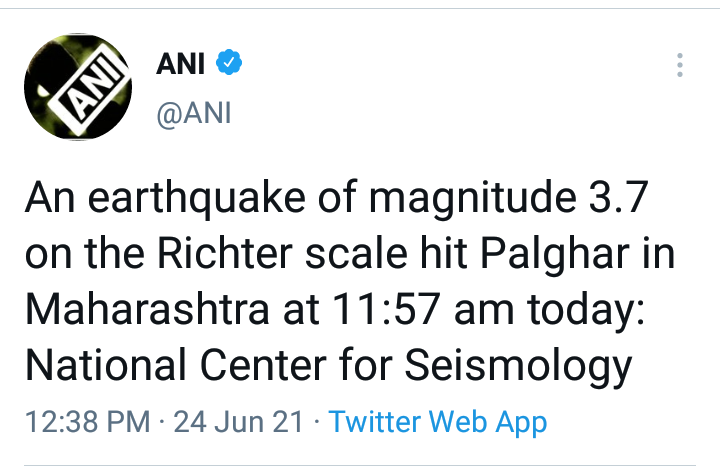 महाराष्ट्रातील पालघर जिल्ह्यात गुरुवारी भूकंपाचे धक्के जाणवले. सकाळी 11 वाजून 57 मिनिटांनी हा भूकंप झाला.