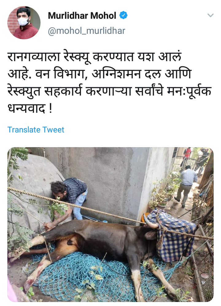 दरम्यान, पुण्याचे महापौर मुरलीधर मोहळ यांनी रानगव्याला रेस्क्यू करण्यात यश मिळाले असल्याचे सांगितले असून त्यांनी वन विभाग, अग्निशमन दल आणि रेस्क्युत सहकार्य करणाऱ्या सर्वांचे मनःपूर्वक आभार मानले आहेत.