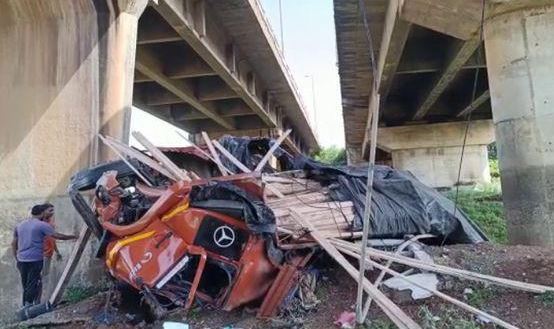 बेळगाव : पुणे-बेंगळूर राष्ट्रीय महामार्गावर चालकाचे नियंत्रण सुटून ट्रक पुलावरून सरळ खाली कोसळल्याची घटना एम के हुबळीनजीक घडला. अपघात इतका भयानक होता की ट्रकचा अक्षरशः चुराडा झाला आहे. चालक मात्र या अपघातातून आश्चर्यकारकरित्या बचावला आहे.