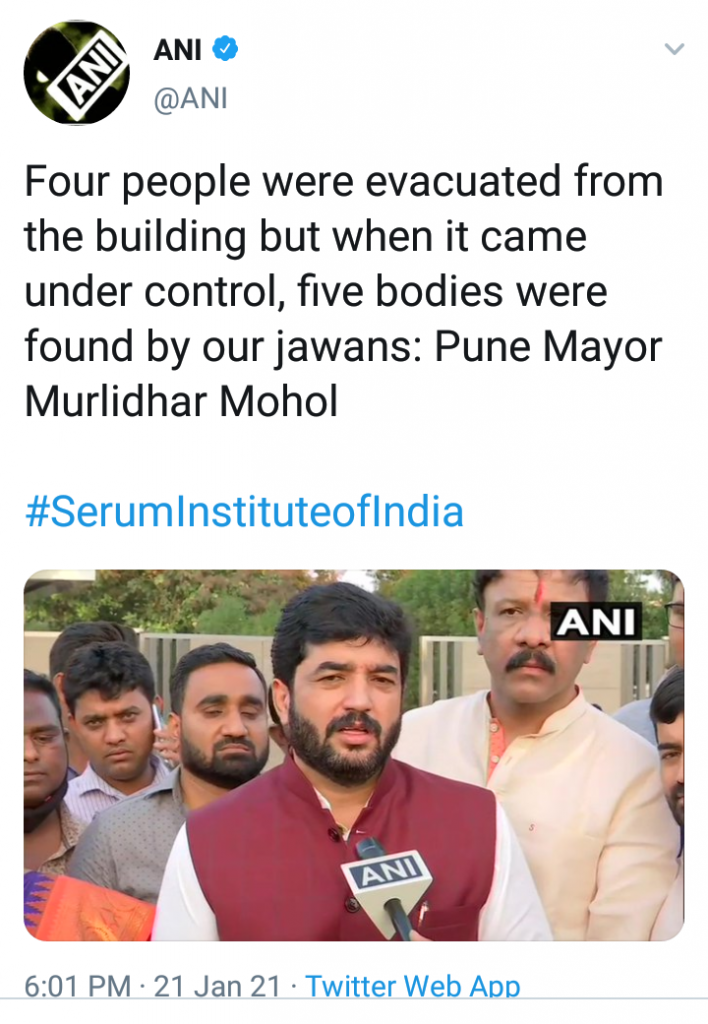 सीरम इन्स्टिट्यूटमध्ये इमारतीला लागलेल्या आगीत 5 जणांचा मृत्यू झाला असल्याची माहिती पुण्याचे महापौर मुरलीधर मोहोळ यांनी दिली आहे.