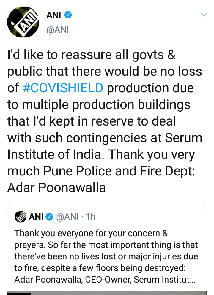 या घटनेबाबात अधिक महिती देताना संस्थेचे प्रमुख आदर पुनावाला म्हणाले की, या आगीत कोरोना लसीच्या प्रोडक्शनचे कोणतेही नुकसान झालेले नाही.