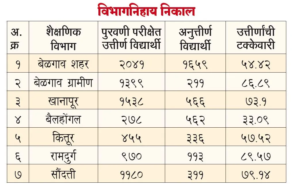 विभागनिहाय निकालाच्या टककेवारीत बेळगाव शहराची पुन्हा घसरण झाली असून निकाल 54.41 टकके इतका आहे. तर त्यातुलनेत बेळगाव ग्रामीणचा निकाल समाधानकारक असून 86.39 टकके इतका निकाल लागला आहे. निकाल वाढीच्या दृष्टीने विद्यार्थ्यांची गुगलमीट घेण्यात यावी अशा सूचना करण्यात आल्या होत्या. मात्र त्याची अंमलबजावणी आणि यासाठीचे अडथळे यामुळे पुरवणी परीक्षेच्या निकालात देखील घसरणच झाली आहे.