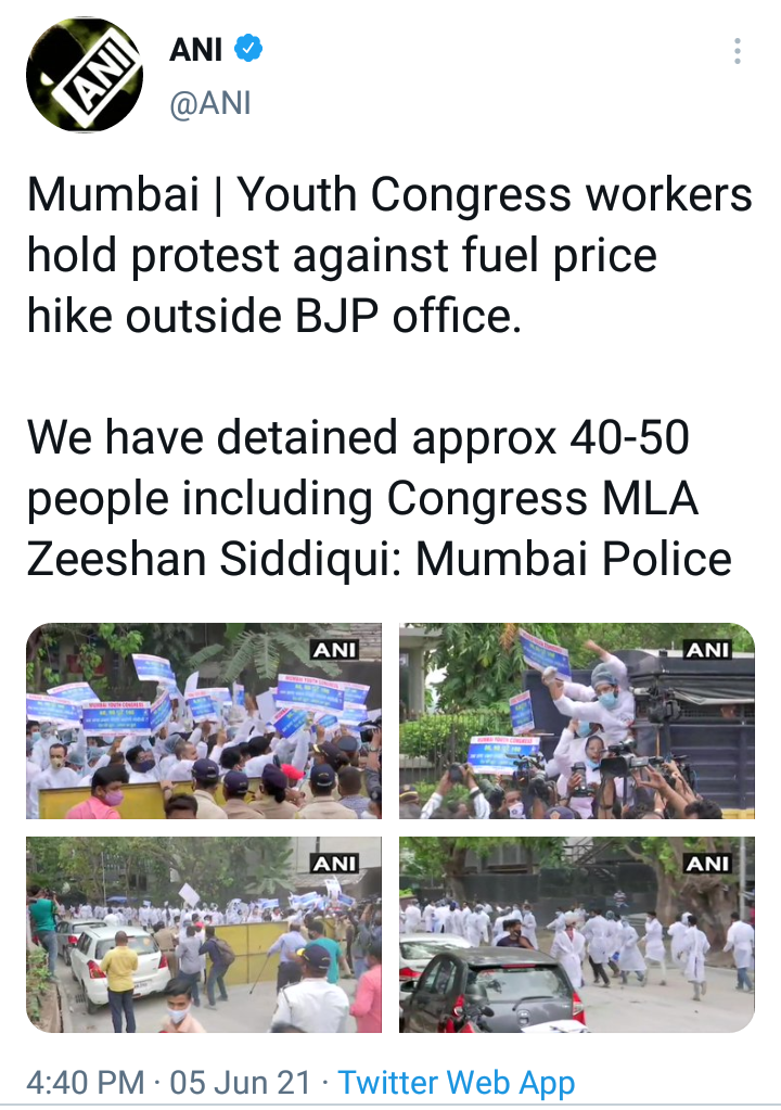 यावेळी मोठ्या संख्येने कार्यकर्ते उपस्थित होते. या कार्यकर्त्यांनी पेट्रोल आणि डिझेलच्या वाढत्या किंमतीला विरोध दर्शवत केंद्र सरकारच्या विरोधात नारेबाजी केली. दरम्यान, भाजप कार्यालयाबाहेर आंदोलन करत असलेल्या 40 ते 50 कार्यकर्त्यांना आणि काँग्रसचे आमदार जीशान सिद्दीकी यांना मुंबई पोलिसांनी ताब्यात घेतले आहे.