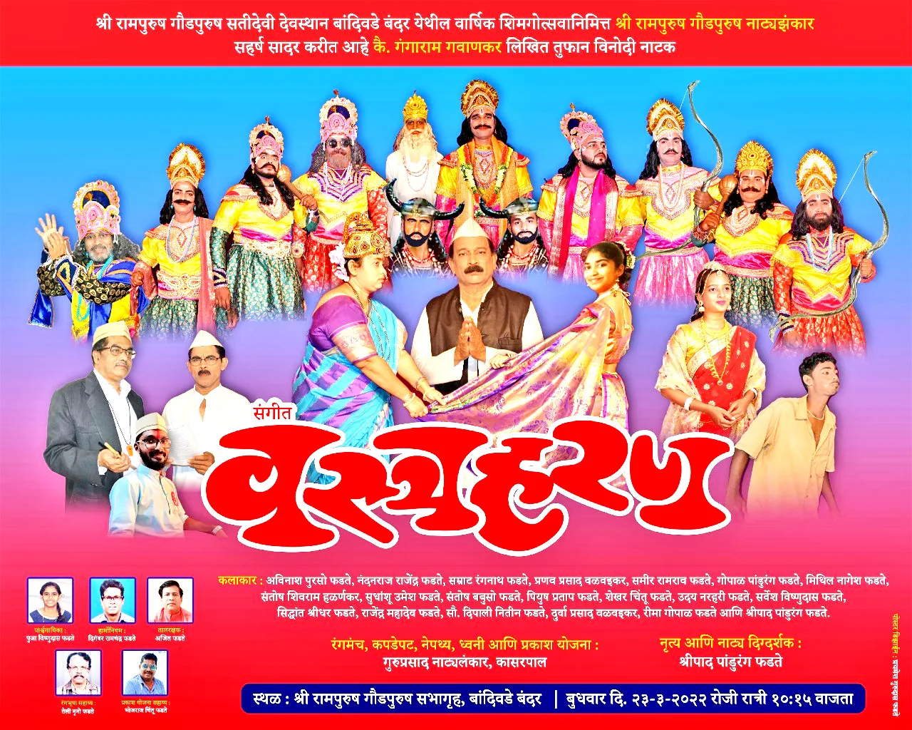 बांदिवडे बंदर येथील श्री रामपुरूष गौडपुरूष सतीदेवी देवस्थानच्या शिमगोत्सवानिमित्त श्री रामपुरूष गौडपुरूष नाटय़झंकार निर्मित सं. ‘वस्त्रहरण’ नाटय़प्रयोग बुधवार दि. 23 रोजी रात्री 10.15 वा. बंदर येथे सादर करण्यात येणार आहे.