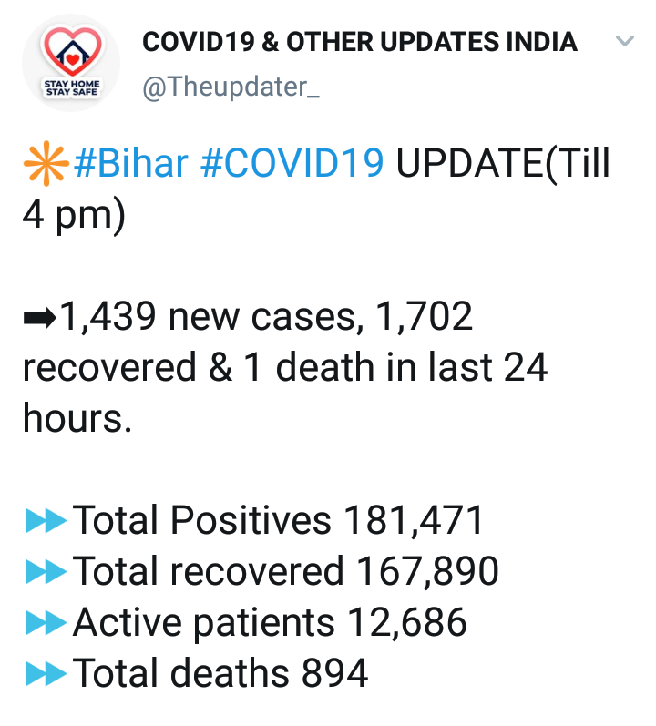 मिळालेल्या माहितीनुसार, तर कालच्या दिवसात 1,702 रुग्णांना डिस्चार्ज देण्यात आला. तर बिहारमधील एकूण 1,81,439 रुग्णांपैकी आता पर्यंत 1 लाख 67 हजार 890 रुग्ण कोरोनामुक्त झाले आहेत. सध्या राज्यात रुग बरे होण्याचे प्रमाण 92.52 % आहे. तर आतापर्यंत 894 कोरोनामुळे मृत्यू झाला आहे.