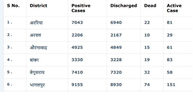 मिळालेल्या माहितीनुसार, कालपासून 674 रुग्णांना डिस्चार्ज देण्यात आला तर बिहारमधील एकूण 2,42,152 रुग्णांपैकी आता पर्यंत 2 लाख 35 हजार 614 रुग्ण कोरोनामुक्त झाले आहेत. सध्या राज्यात रुग बरे होण्याचे प्रमाण 97.30 % आहे. तर आतापर्यंत 1, 312 कोरोनामुळे मृत्यू झाला आहे.