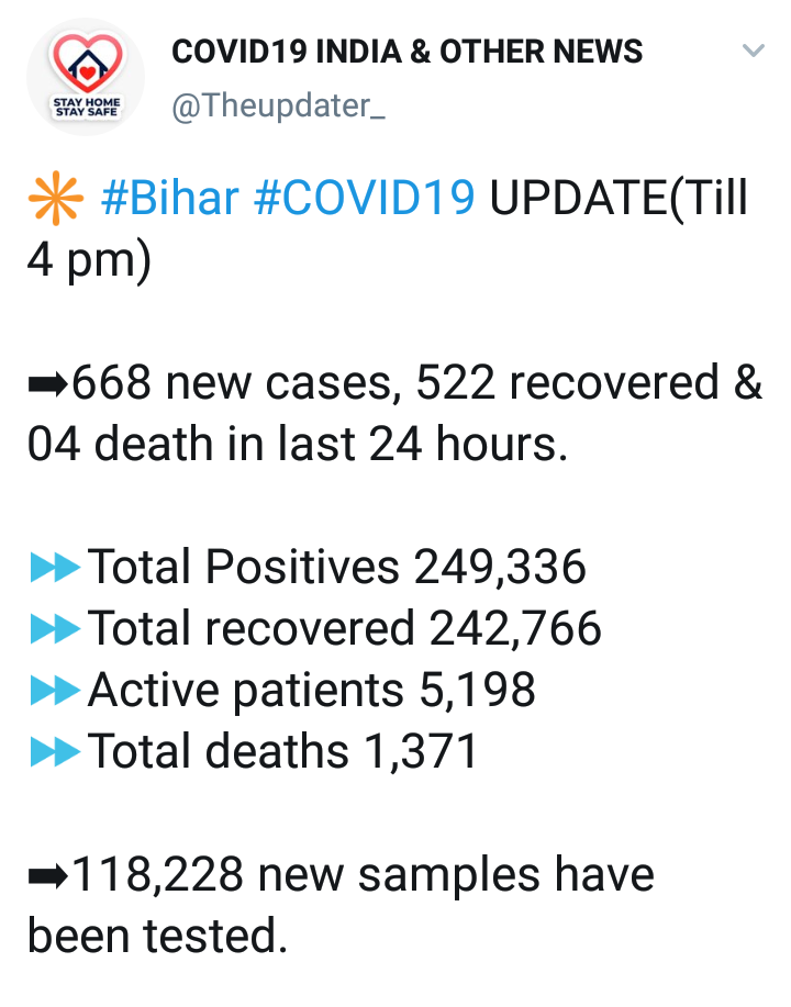 मिळालेल्या माहितीनुसार, कालपासून 522 रुग्णांना डिस्चार्ज देण्यात आला तर बिहारमधील एकूण 2,49,336 रुग्णांपैकी आता पर्यंत 2 लाख 42 हजार 766 रुग्ण कोरोनामुक्त झाले आहेत. सध्या राज्यात रुग बरे होण्याचे प्रमाण 97.37 % आहे. तर आतापर्यंत 1, 371 कोरोनामुळे मृत्यू झाला आहे.