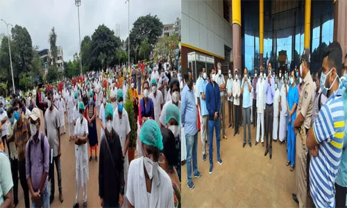 सिव्हिल हॉस्पिटलमधील कोविड-19 वॉर्डमध्ये दाखल करण्यात आलेल्या एका रुग्णाच्या मृत्यूनंतर संतप्त कुटुंबीय व नातेवाईकांनी तुफान दगडफेक करीत रुग्णवाहिका पेटविली. वॉर्डमधील डॉक्टर व वैद्यकीय कर्मचाऱयांवर हल्ल्याचाही प्रयत्न झाला आहे. बुधवारी रात्री 9.15 वाजण्याच्या सुमारास घडलेल्या या घटनेने परिसरात तणाव निर्माण झाला होता. या घटनेच्या निषेधार्थ आज बीम्स कॉलेज व सिव्हिल इस्पितळ स्टाफने धरणे आंदोलन केले. यावेळी डॉक्टर व वैद्यकीय कर्मचाऱयांच्या सुरक्षिततेचा मुद्दा उपस्थित करण्यात आला. घडलेल्या घटनेच्या निषेधार्थ घोषणाही देण्यात आल्या. बीम्स कॉलेज व सिव्हिल इस्पितळामधील सर्व डॉक्टर व वैद्यकीय कर्मचाऱयांनी यात सहभाग घेतला होता. दरम्यान जिल्हाधिकारी एम. जी हिरेमठ यांनी घटनास्थळी भेट देऊन अशा घटना भविष्यात घडणार नाहीत, यासाठी प्रशासन योग्य ती खबरदारी घेण्यात घेईल तसेच जिल्हा तसेच तालुक्यातील प्रत्येक रूग्णालयात कोरोना रूग्णांसाठी आवश्यक सोयी, सुविधा पुरविण्यात येतील असे आश्वासन दिले. यानंतर आंदोलन मागे घेण्यात आले.