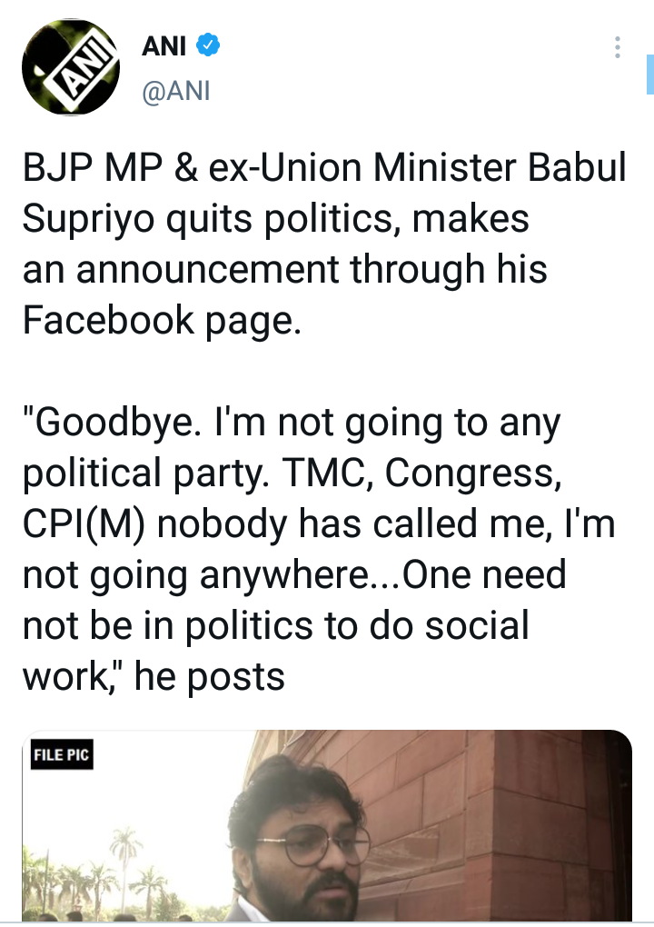 याबाबत अधिक माहिती देताना बाबुल सुप्रियो यांनी आपल्या पोस्टमध्ये म्हटले की, ‘गुडबाय…. मी कोणत्याही राजकीय पक्षात जात नाहीये, टीएमसी, काँग्रेस, सीपीआय (एम) कोणीही मला बोलावलेले नाही, मी कुठेही जाणार नाही. समजाकार्य करण्यासाठी राजकारणातच असण्याच गरज नाही.’