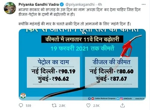 ”ज्या दिवशी डिझेल-पेट्रोलच्या दरात वाढ होणार नाही त्या दिवशी भाजप सरकारला आठवड्यातील त्या दिवसाचं नाव ‘अच्छा दिन’ करायला हवं. कारण वाढत्या महागाईच्या काळात अन्य दिवस तर सर्वसामान्यांसाठी ‘महंगे दिन’ आहेत.” असं प्रियंका गांधी यांनी ट्विटद्वारे म्हटलं आहे.