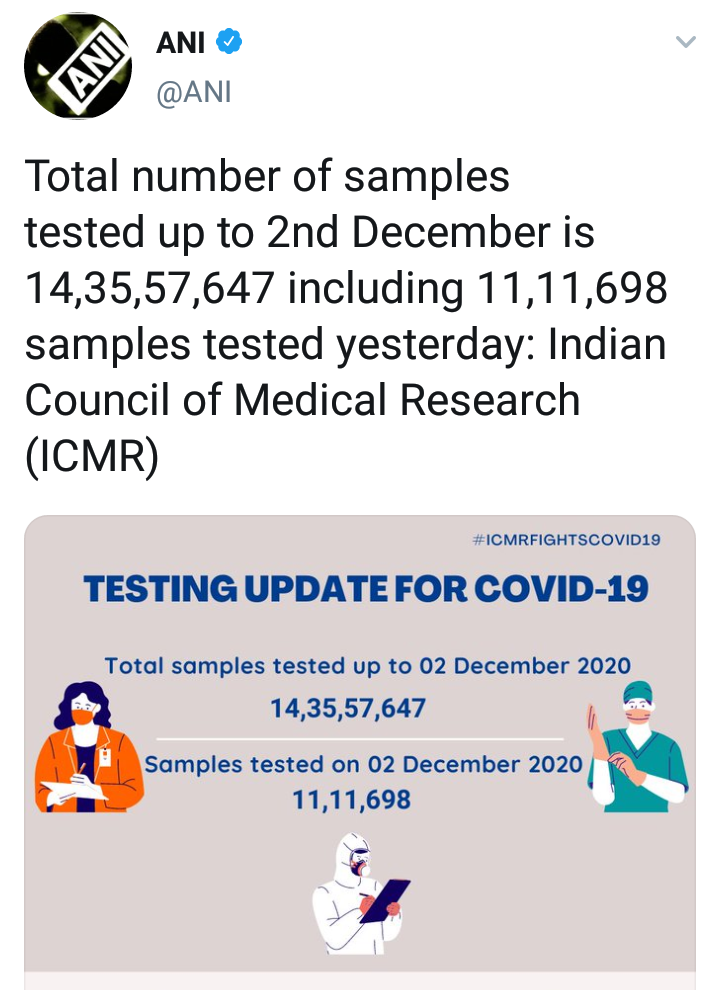 आतापर्यंत देशात 14 कोटी 35 लाख 57 हजार 647 नमुन्यांची तपासणी करण्यात आली आहे. त्यापैकी 11 लाख 11 हजार 698 कोरोना चाचण्या बुधवारी (दि.2 डिसेंबर) एका दिवसात करण्यात आल्या.