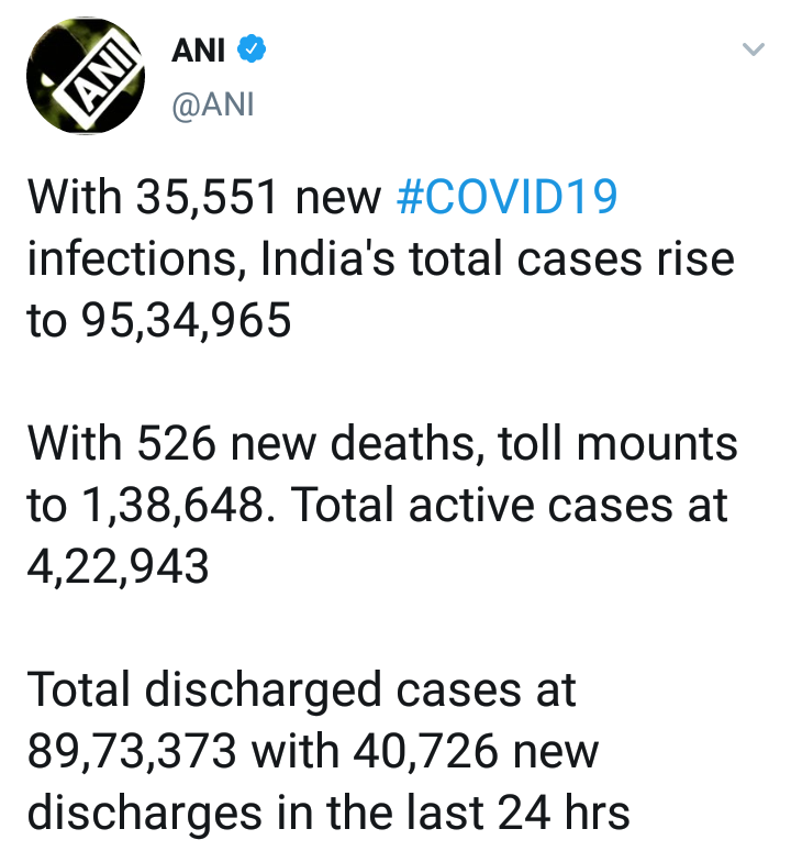 भारतात मागील 24 तासात 35 हजार 551 नवे कोरोनाबाधित रुग्ण आढळून आले. तर 526 रुग्णांचा मृत्यू झाला आहे. त्यामुळे देशातील एकूण कोरोनाबाधितांची संख्या आता 95 लाख 34 हजार 965 वर पोहचली असून, मृतांची संख्या 1 लाख 38 हजार 648 एवढी आहे.