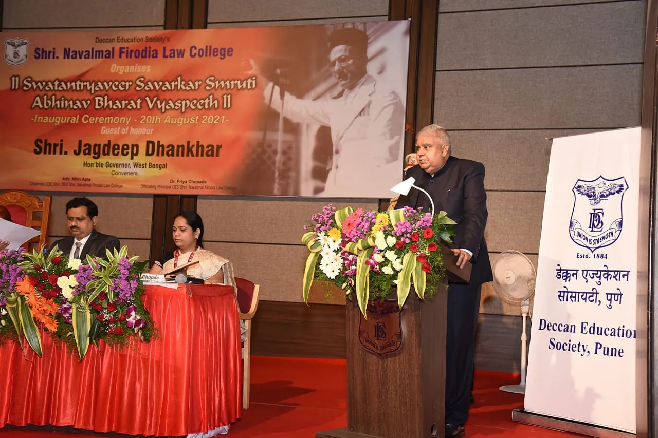 डेक्कन एज्युकेशन सोसायटीच्या श्री नवलमल फिरोदीया लॉ कॉलेजतर्फे आयोजित स्वातंत्र्यवीर सावरकर स्मृती अभिनव भारत व्यासपीठाचे, महाविद्यालयातर्फे सुरु करण्यात आलेल्या तीन अभ्यासक्रमांचे तसेच अटल लिट फेस्टीवल या उपक्रमाचे उद्घाटन राज्यपाल धनखड यांच्या हस्ते करण्यात आले. त्यानंतर ते बोलत होते. राज्यपालांच्या पत्नी सुधेश धनखर, डेक्कन एज्युकेशन सोसायटीच्या नियामक मंडळ परिषदेचे अध्यक्ष शरद कुंटे, महाविद्यालयाचे अध्यक्ष ॲड. नितीन आपटे, उपाध्यक्ष महेश आठवले, सोसायटीचे सचिव धनजंय कुलकर्णी आदी यावेळी उपस्थित होते.