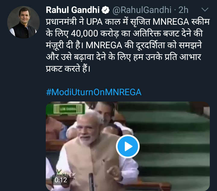 यासोबतच राहुल गांधी यांनी ‘मोदी यु टर्न ऑन मनरेगा’ असा हॅशटॅग वापरला आहे. त्याचबरोबर राहुल गांधी यांनी 2014 मधील पंतप्रधान नरेंद्र मोदींचा संसदेतील भाषणाचा जुना व्हिडिओ देखील शेअर केला आहे.